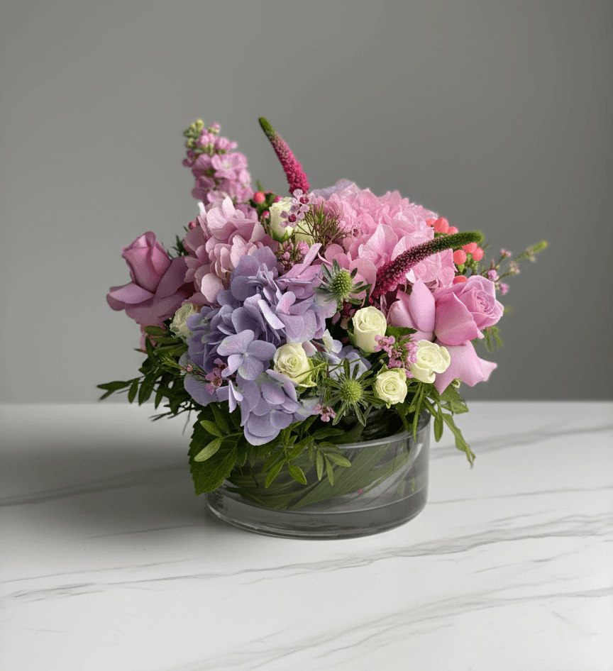 A romantic blend of soft hydrangeas, roses, and delicate seasonal florals in shades of pink and lavender. Arranged in a modern glass round vase.